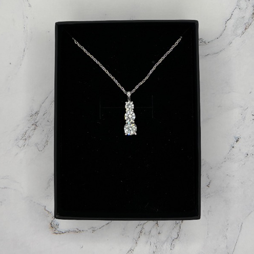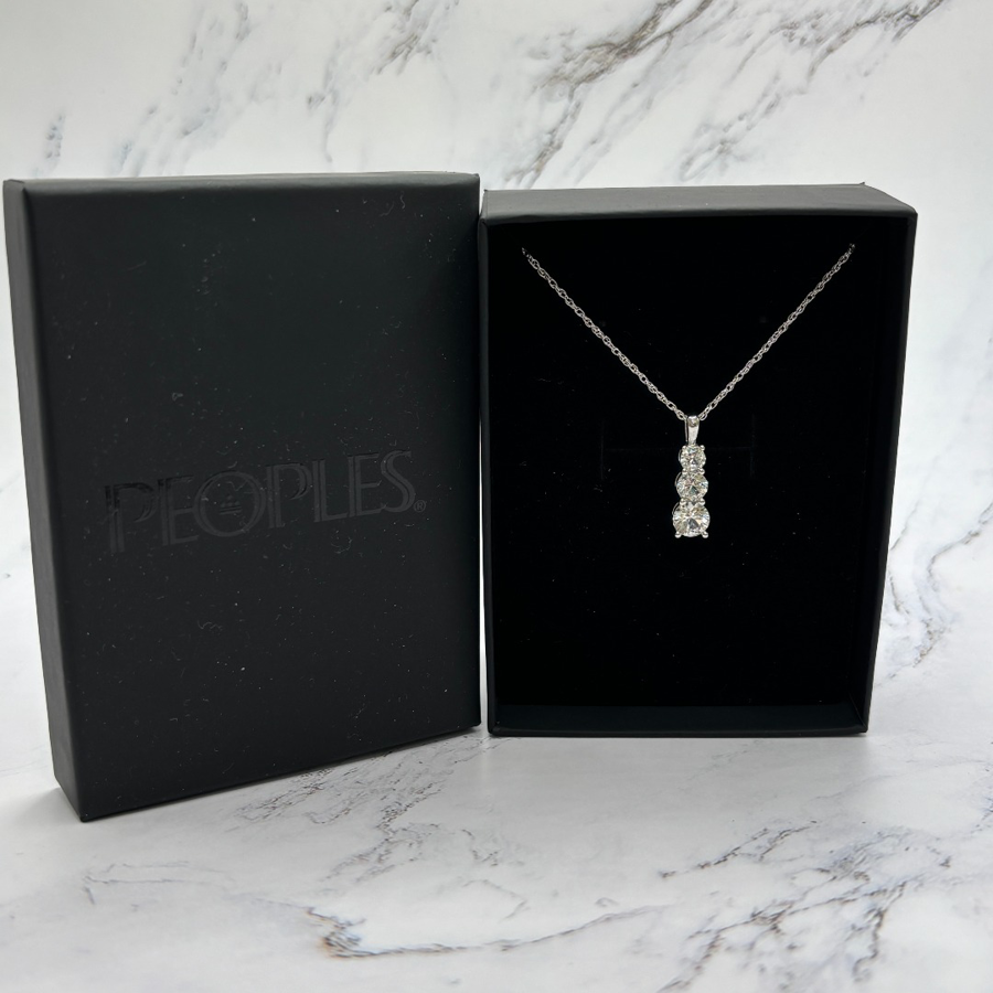 Sparkling white lab-created sapphires graduate in size along this three-stone drop pendant from Peoples Jewellers.