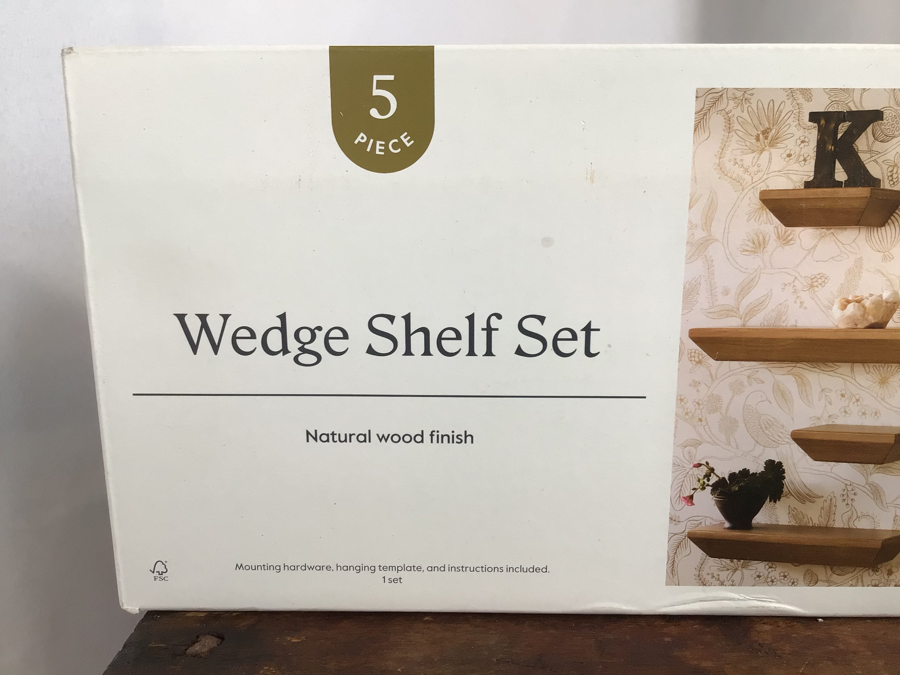 5 piece wedge shelf set, natural wood finish. See listing photos for size of shelves