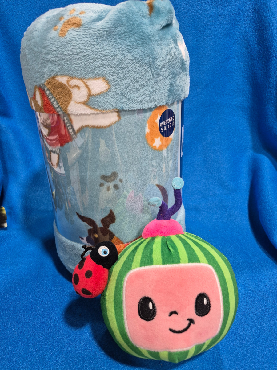 Oversized plush throw with dog print, 5ft x 6ft. From Kohls. Dog toy included, 6".