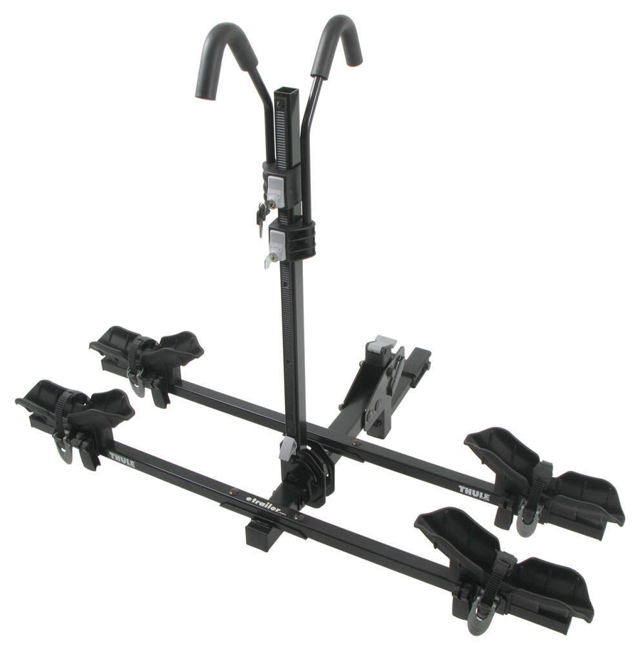 Thule Bike Racks are one of the most popular and reliable hitch-mounted bike racks on the market, perfect for any biking enthusiast who needs a secure and convenient way to transport their bikes. This heavy-duty rack is designed to carry up to 2 bikes and can accommodate a wide variety of bike styles, including e-bikes and fat bikes. Features: • Tool-Free Attachment: Easy to install and remove thanks to the tool-free AutoAttach system. • Secure Bike Hold: Frame-free ratcheting arm and adjustable wheel trays secure your bike at the tires, avoiding frame contact to prevent damage. Built in locking mechanism to keep bikes theft-proof when unattended. • Tilt Function: Integrated HitchSwitch lever allows you to tilt the rack down for easy trunk access, even with bikes loaded, and tilt it up when not in use. • High Load Capacity: Supports bikes with up to a 60 lb weight capacity per bike (120 lbs total), ideal for heavy e-bikes and mountain bikes. • Fits Most Tire Sizes: Accommodates tire widths up to 5” without needing additional adapters, making it suitable for fat bikes. • Compatibility: Works with 1.5 and 2” hitch (has adapter). Perfect for anyone who wants a premium bike rack that’s both easy to use and durable. Secure your bikes with confidence and enjoy the road! This bike rack was previously owned and is in excellent condition. Instructions Included Sells for $1000 new.