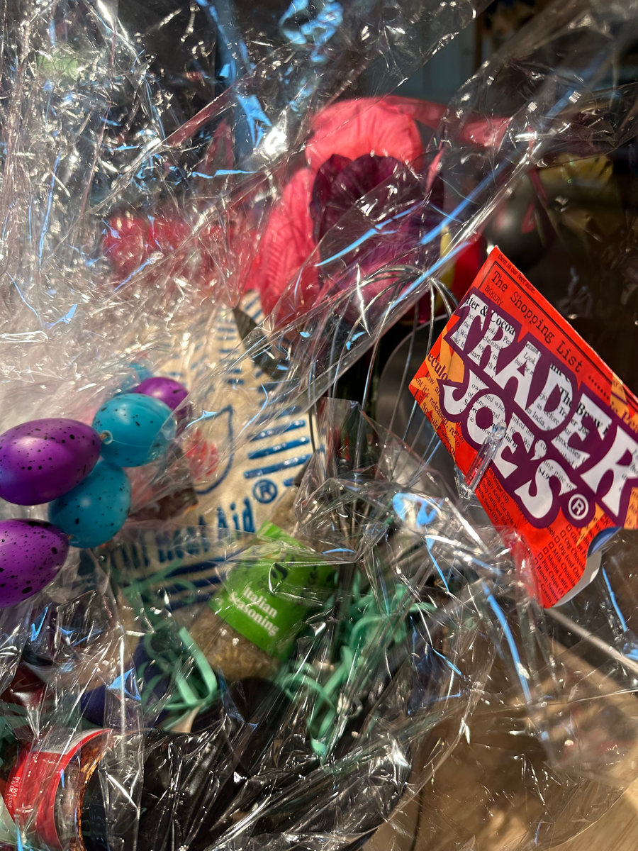 Basket Includes: Crockpot, Gift card to Trader Joes, 2 Gift cards to Safeway, kitchen utensils, italian seasoning, an assortment of spices, kitchen towel, apron, heat gloves