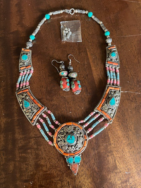 Coral and turquoise adorn this ornate alloy necklace, with bold earrings to match, handcrafted in Nepal with the use of mixed metals and semi-precious stones. This design is a traditional Nepalese design created using materials that blend durability and antique aesthetic appeal.