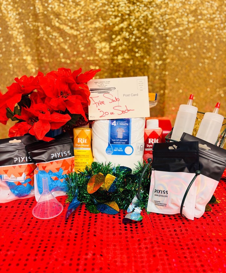 Tie- Dye kit with a free sub and a 20 oz soda from James' General and t-shirts.