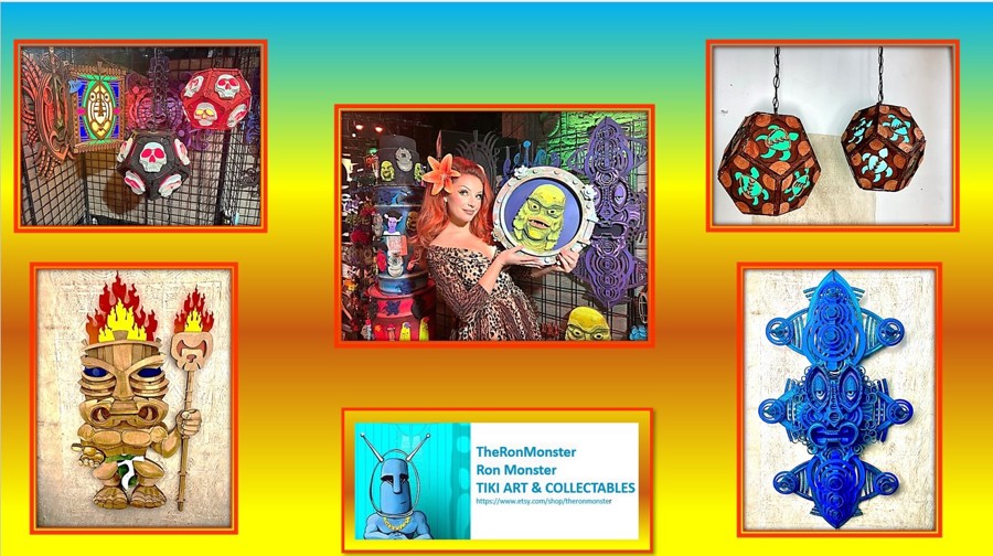Ron sells at Tiki and Monster Shows, including Tiki Oasis, Tiki Caliente, Midsummer Scream and Monsterpalooza. Selling purses, lamps, ornaments, and wall art.