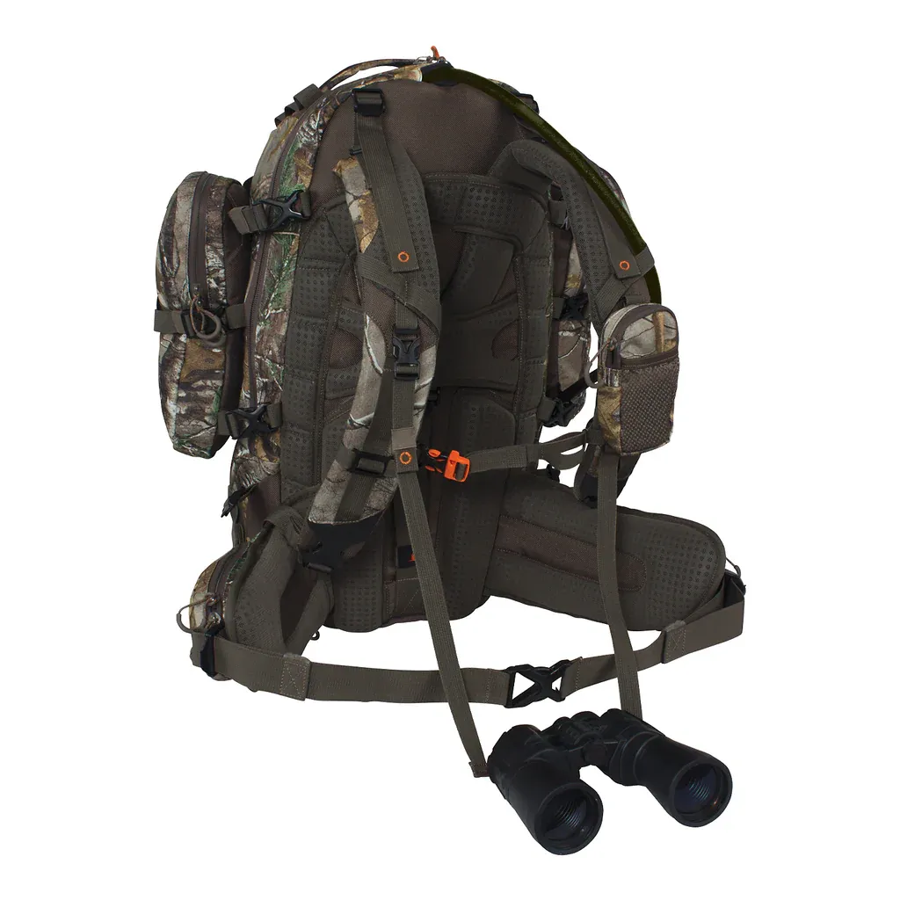 Crafted of polyester brushed tricot with PVC backing, this quiet-cloth backpack includes a pull-out orange blaze rain cover to protect and provide visibility when needed. It also comes with a two-liter hydration bladder with insulated hose. Raptor compression straps shrink the pack for load stability, while right and left hip belt accessory pockets give instant access to gear or snacks.