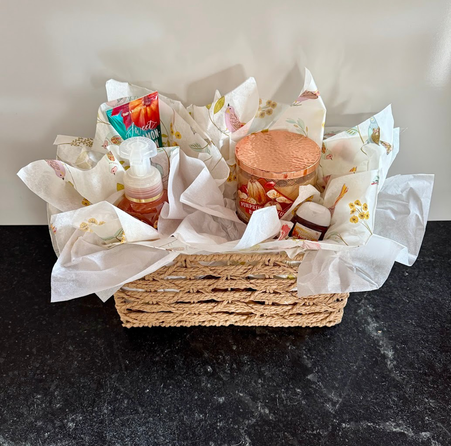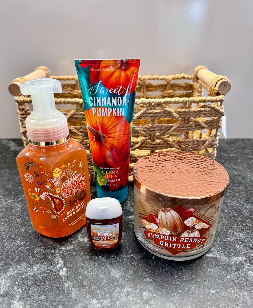 Pamper yourself or someone else with the "Time to Relax" basket that celebrates the autumn season. The basket contains a pumpkin peanut brittle scented 3-wick candle, exfoliating mesh balls, pecan pumpkin waffle foaming hand soap and marshmallow pumpkin latte anti-bacterial hand gel.