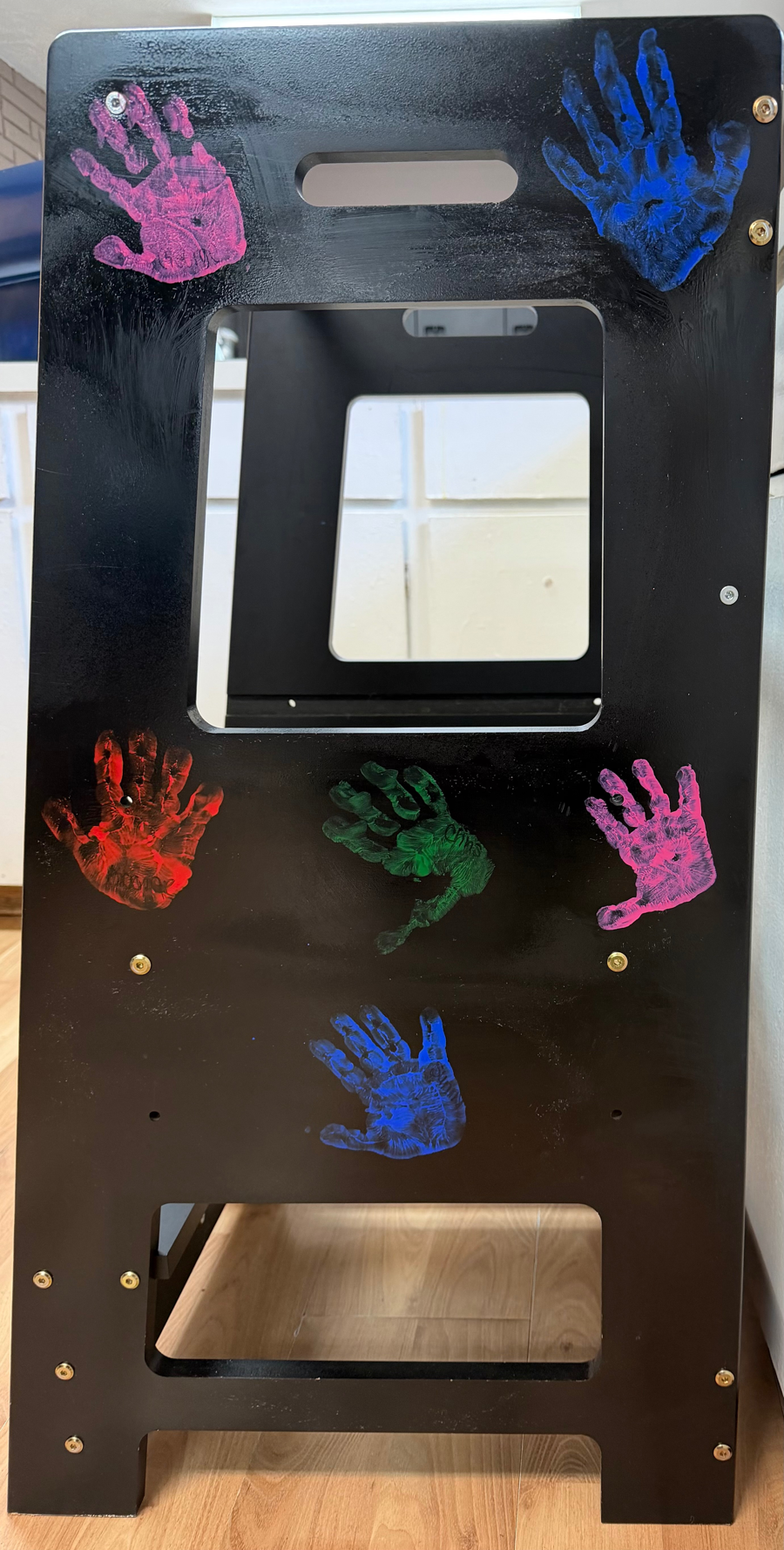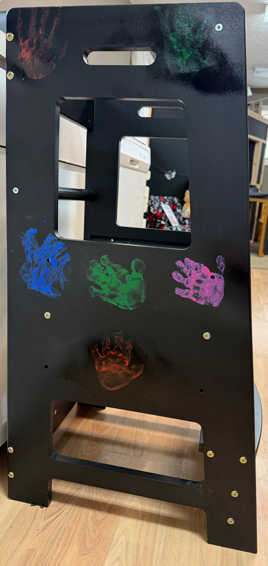 Thise adorable stool will help your little one help you in the kitchen. Studies show that children helping in the kitchen...is fun for all! They will be so proud of whatever you create. Especially when they climb on this stool with their (and their friend's) handprint on it. It will be a great conversation starter.