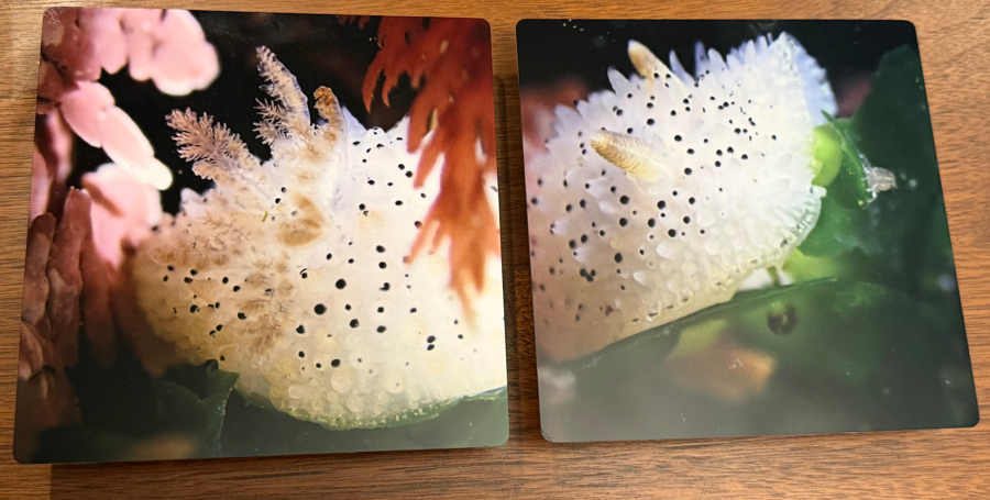 Two 5x5" metal prints with rounded edges & mounts. A black & white dorid scooting through its habitat.