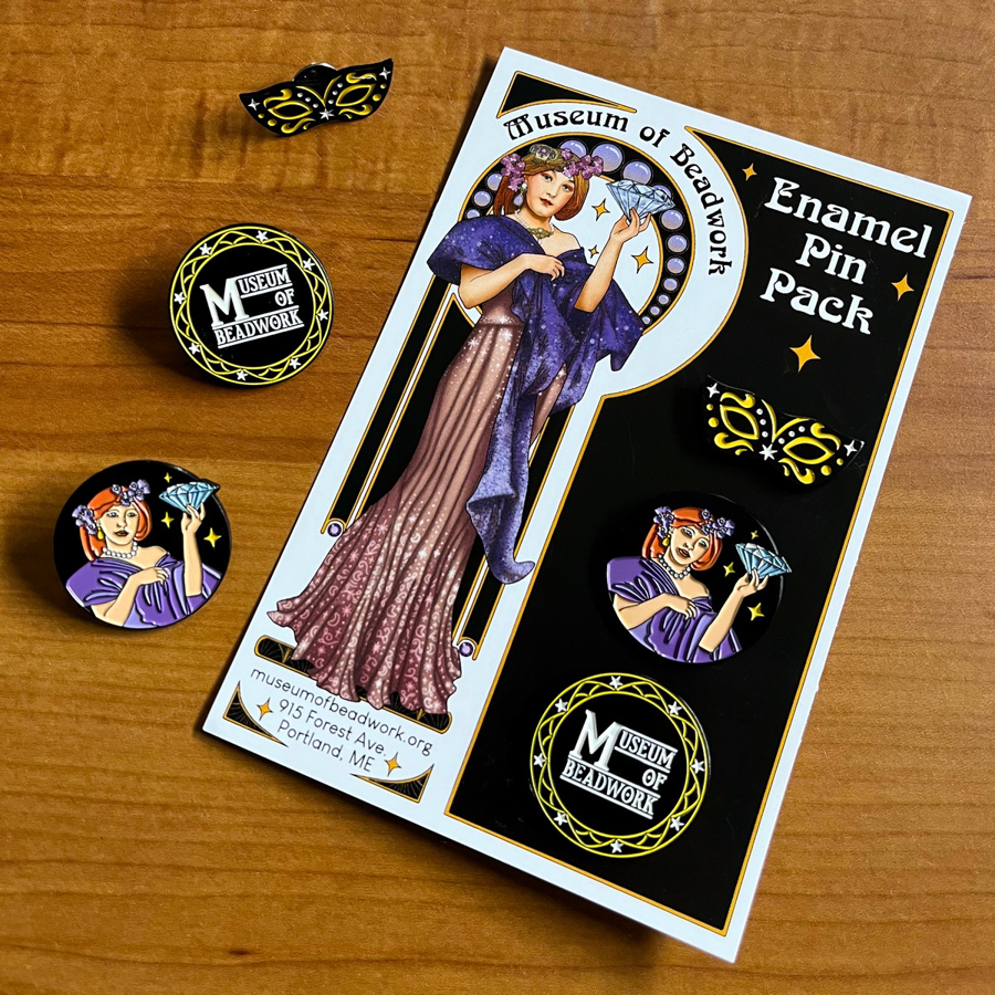 A package of two MOB totes (two separate designs) and an MOB enamel lapel pin pack. Stitches Tote: A versatile 100% cotton tote made of a durable 12oz canvas and printed locally with our original "My Main Stitches" design. Measurements are 15" by 15" and 5" deep with 22" cotton webbing handles. Sturdy, durable, and very unique! Logo Tote: Our official Museum of Beadwork Tote! Black canvas with white print, this tote measures 14.25" X 15.5". Perfect for books, laptop, groceries, or even beadwork! Enamel Pin Pack: Three original design enameled pins in etched metal and attach with a lapel pin and butterfly pin back. Each pin is 1.25" in diameter and come on a 4"x6" card.