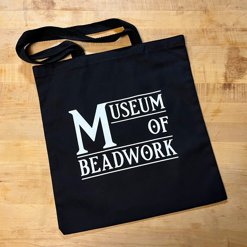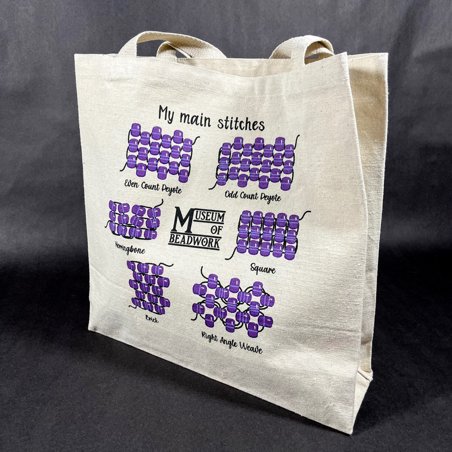 A package of two MOB totes (two separate designs) and an MOB enamel lapel pin pack. Stitches Tote: A versatile 100% cotton tote made of a durable 12oz canvas and printed locally with our original "My Main Stitches" design. Measurements are 15" by 15" and 5" deep with 22" cotton webbing handles. Sturdy, durable, and very unique! Logo Tote: Our official Museum of Beadwork Tote! Black canvas with white print, this tote measures 14.25" X 15.5". Perfect for books, laptop, groceries, or even beadwork! Enamel Pin Pack: Three original design enameled pins in etched metal and attach with a lapel pin and butterfly pin back. Each pin is 1.25" in diameter and come on a 4"x6" card.