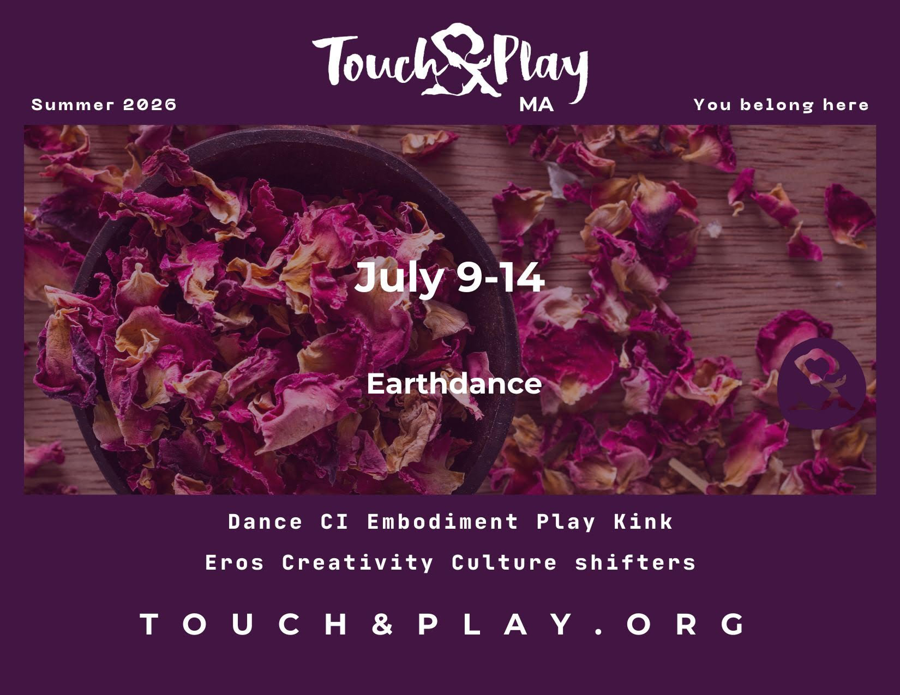 25% Discount for a Touch&Play retreat (July 9-14 2026) Touch&Play invites individuals to explore their embodied authenticity and relational dynamics in safer and consensual spaces. It acknowledges that embracing life is as much about celebrating strengths and virtues, as it is about knowing one’s limits, and shadows, thus fostering a creative journey of self-discovery and growth. in-person Earthdance MA EXP Date: July 14th 2026