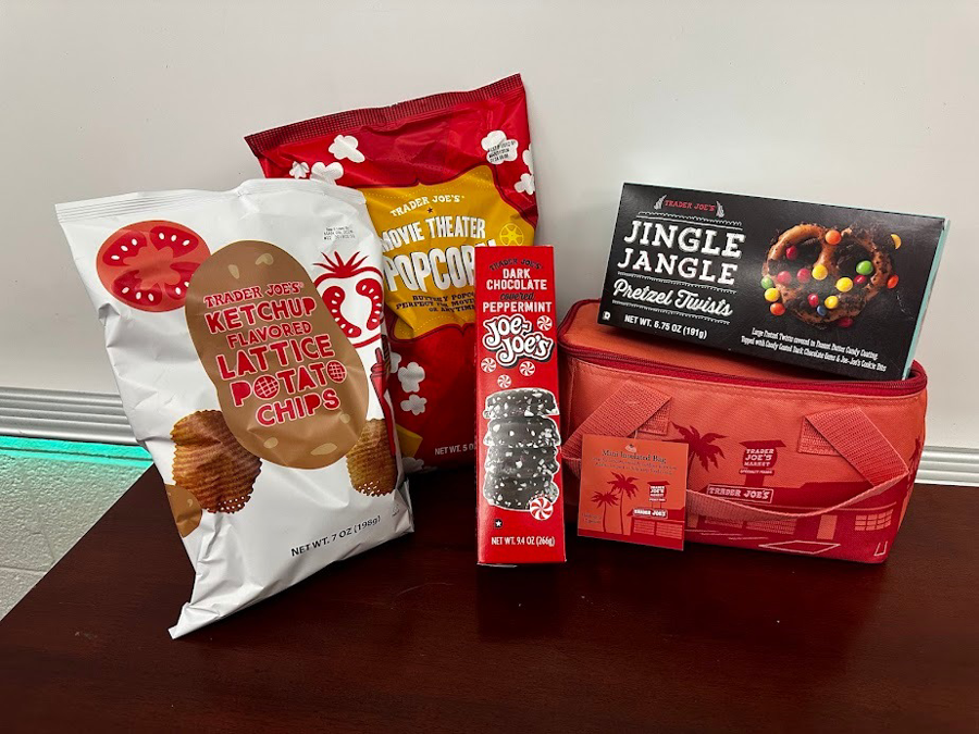Trader Joe's Basket Includes: 1.5 gallon insulated lunch box, Jingle Jangle Pretzel Twists, Dark Chocolate Peppermint Joe-Joe's, Ketchup Chips, Movie Theater Popcorn Donated by: The Campbell Family