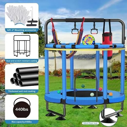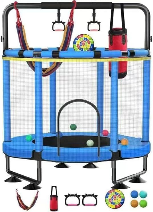 Introducing a fantastic 55" trampoline with an enclosure that promises endless fun and safety for your kids! This trampoline comes equipped with a sturdy enclosure to keep jumpers secure while they bounce to their heart's content. Included with the trampoline are accessories, such as a swing, a dartboard, a sandbag, a ring, and balls, that enhance the jumping experience. Whether you're looking for a way to keep the kids active or simply want to enjoy some outdoor fun, this trampoline is the perfect addition to your backyard.