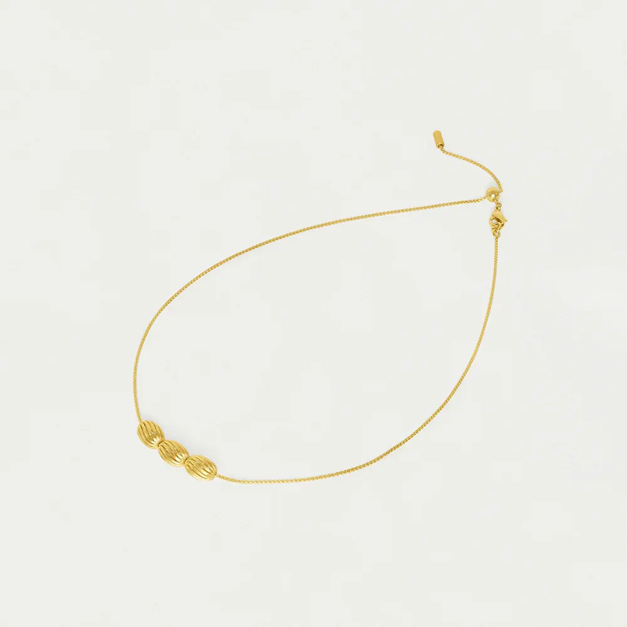 YOUR NECK IS SO ELEGANT (AND MINI)! Rounded macramé-inspired beads hang from a delicate chain for an eye-catching piece that works on its own or layered with your fave necklaces. Metal: DD Signature Brushed Gold Plated Over High-Quality Brass. Length: 14" - 19" (adjustable)