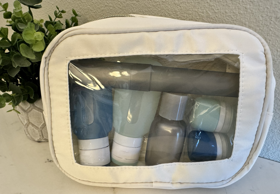 (1) Zippered Travel Bag with a set of TSA approved travel containers.