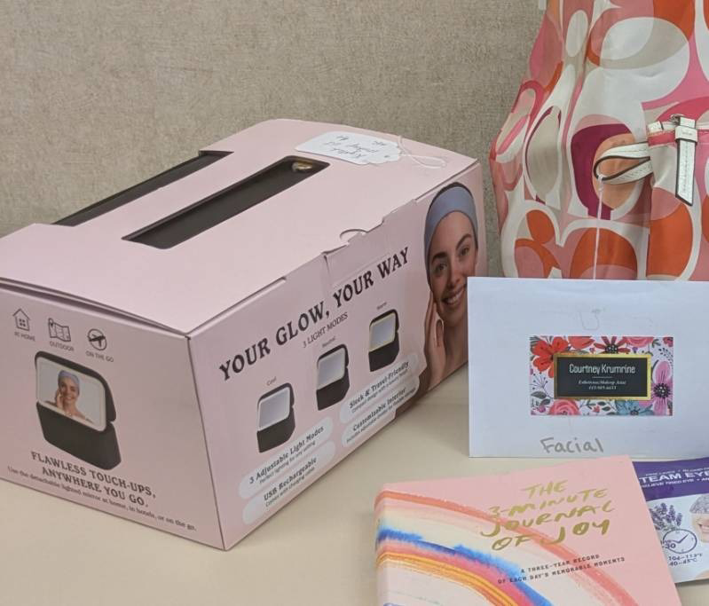 Coach Tote, Cosmetic Bag & Identification Badge (Susan Glover) make up kit, headband, Three minute Journal of Joy, Crush Orange Jellybeans, beach candle, fruit infusions wine(Debbie Cavey)