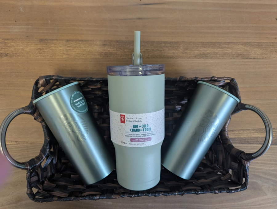 1 x 24 oz President's Choice Stainless Steel Travel Tumbler with 2 x 12 oz Starbucks Recycled Metal Green Tumbler. All cups are insulated and can be used for hot or cold beverages.