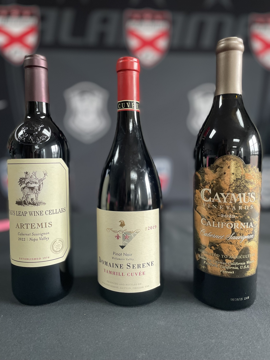 Bottles are: Stag's Leap Artemis Cabernet, Caymus Vineyards Cabernet and Domaine Serene pinot noir