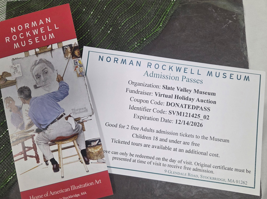 Tickets are good for two (2) adult admissions to the Norman Rockwell Museum. This item can be picked up or shipped via USPS First Class Mail.