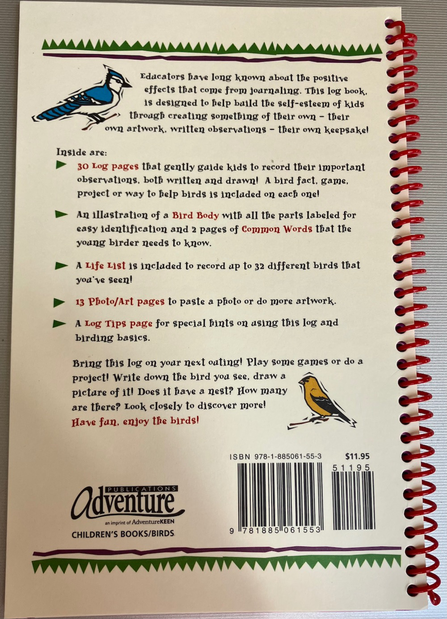 Bird Log Kids by DeAnna Ortiz Brandt. A kid’s journal to record their birding experiences. Soft-cover, spiral-bound. Includes tips for keeping a journal, bird body parts and facts, and common words associated with birding.
