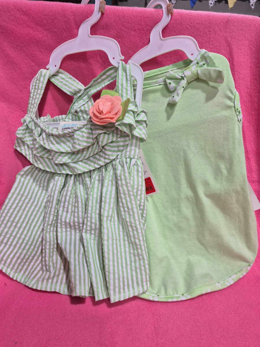 2 dog outfits. 1 dress and 1 knit shirt for Easter and St Patricks day. Size medium. New.
