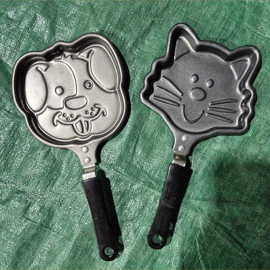 2 non stick, 5" skillets, one dog and one cat. Very cute for pancakes