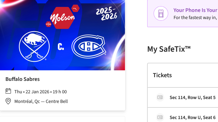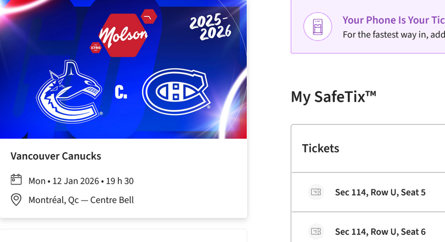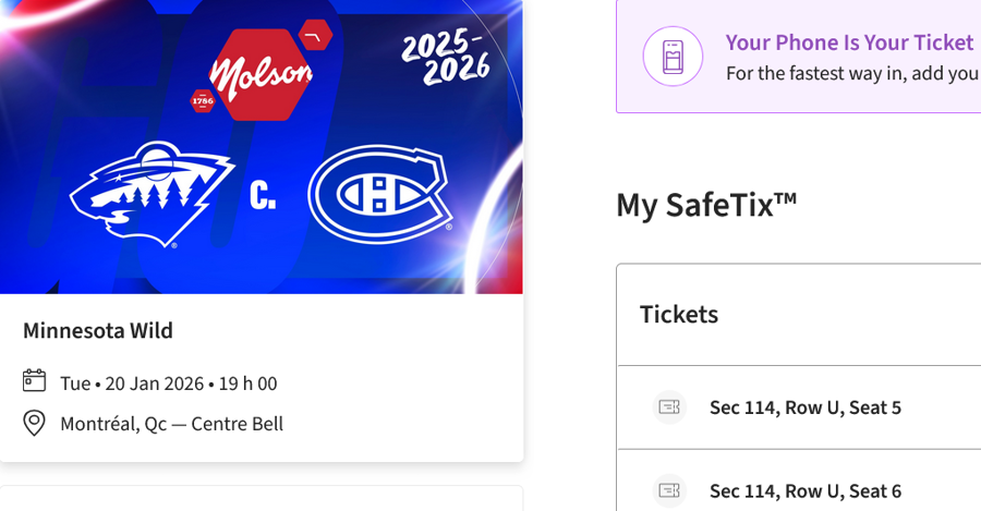 Two tickets to a Montreal Canadiens hockey game at the Bell Centre, Section 114, Row U, Seats 5 and 6. Choice of three possible dates: Montreal Canadiens vs Vancouver Canucks (Monday, January 12 at 7:30 p.m.) Montreal Canadiens vs Minnesota Wild (Tuesday, January 20 at 7 p.m.) Montreal Canadiens vs Buffalo Sabres (Thursday, January 22 at 7 p.m.) * Deux billets pour un match de hockey des Canadiens de Montréal au Centre Bell, section 114, rangée U, sièges 5 et 6. Choix entre trois dates possibles : Montreal Canadiens vs Vancouver Canucks (lundi 12 janvier à 19 h 30) Montreal Canadiens vs Minnesota Wild (mardi 20 janvier à 19 h) Montreal Canadiens vs Buffalo Sabres (jeudi 22 janvier à 19 h)