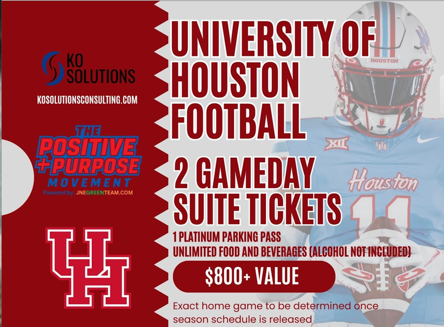 Two suite tickets to a University of Houston Football game, including one (1) platinum parking pass and unlimited food and non-alcoholic beverages. The game will be determined once the UH Football season schedule is released.