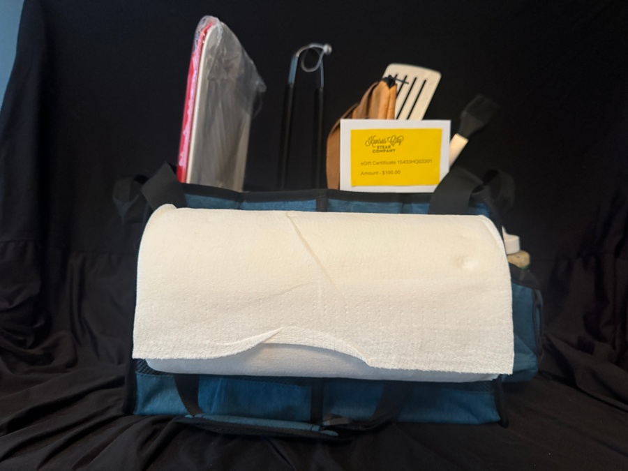 All your BBQ essentials in 1 basket. Enjoy having all your BBQ essentials in one place? Well this is your basket!! This bag is equipped with Condiments, BBQ sauces, seasonings, Utensils, a towel, Resting meat bag, gloves, grill wipes, trays and even a roll of paper towels!! Accompanied with a $100 gift card to Kansas City Steak company you are sure to be the favorite at your next BBQ!!
