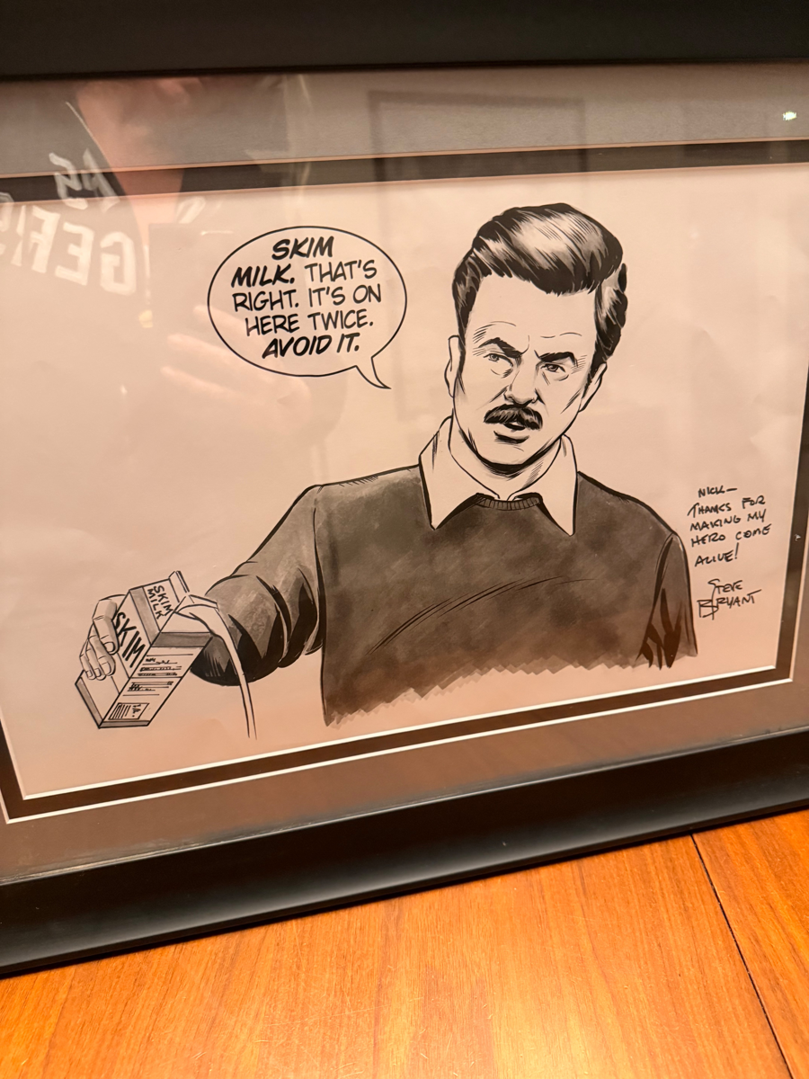 Donated by Ron Swanson himself. You can own Duke Silver’s gold record, and two other incredible pieces of fan art previously owned by Nick, as well as a hat signed by Nick. It’s a pretty good Offer, man (sorry).