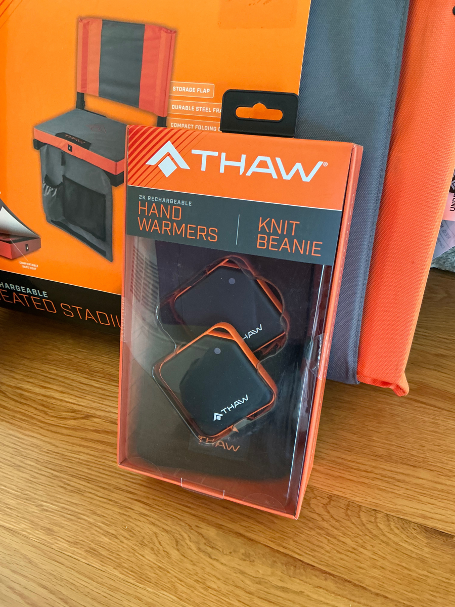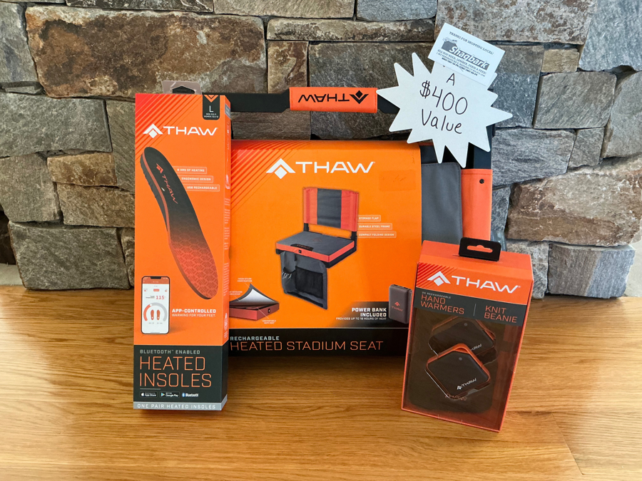 Stay toasty in the cool weather with this ultimate warm-up bundle donated by Shagbark. Includes: THAW Heated stadium seat THAW rechargeable hand warmers Knit beanie One pair of THAW Bluetooth enabled heated insoles size large (men 9.5-11, women 10.5-12) This would make a great gift!