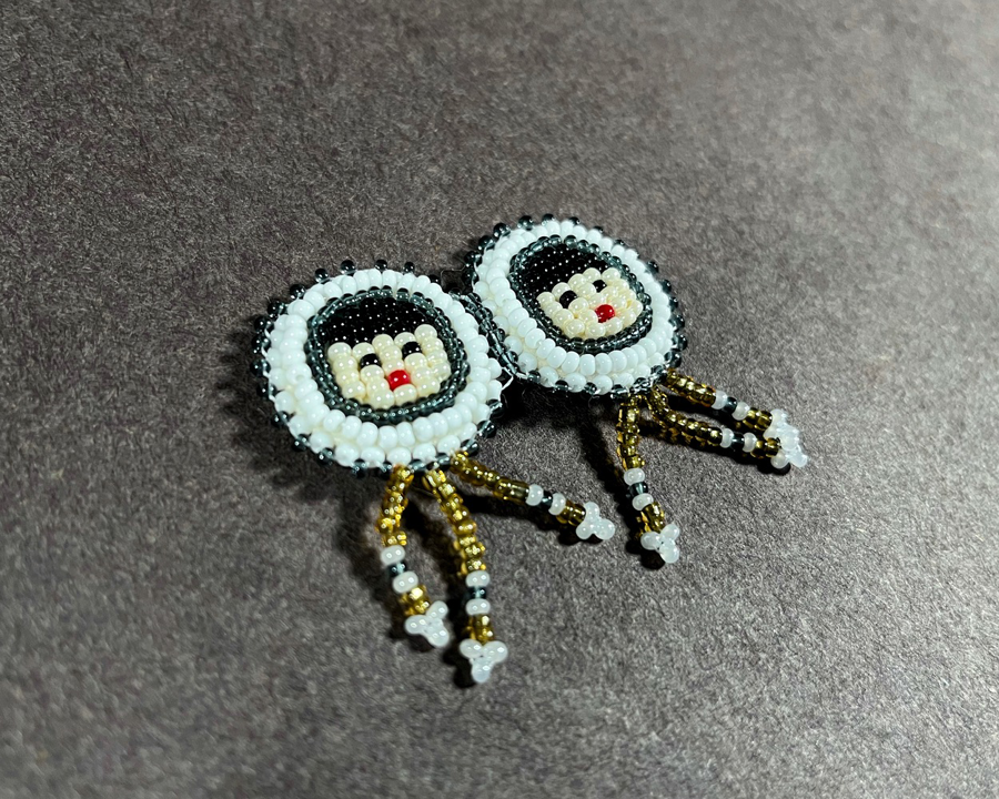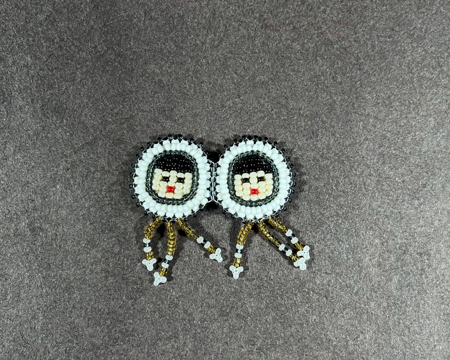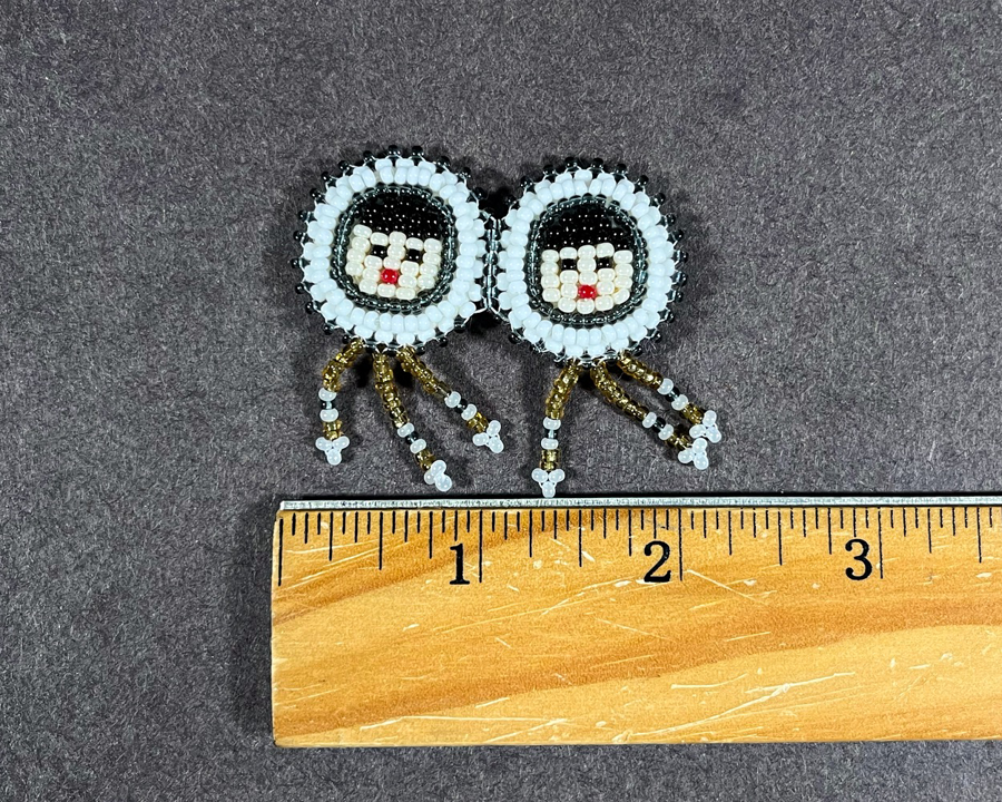 Made by Indiginous Artist Mary Okheena and purchased from Northwest Territories Arts in Yellowknife, this beautiful brooch is bead embroidered with glass seed beads. Measures 2" wide.