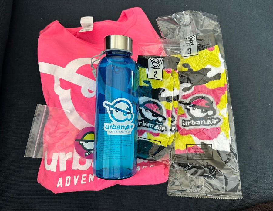 This basket includes 2 ultimate tickets and 2 free ICEE cards, plus a gift basket including 2 jump socks, 1 kids t-shirt, a water bottle, and some stickers!