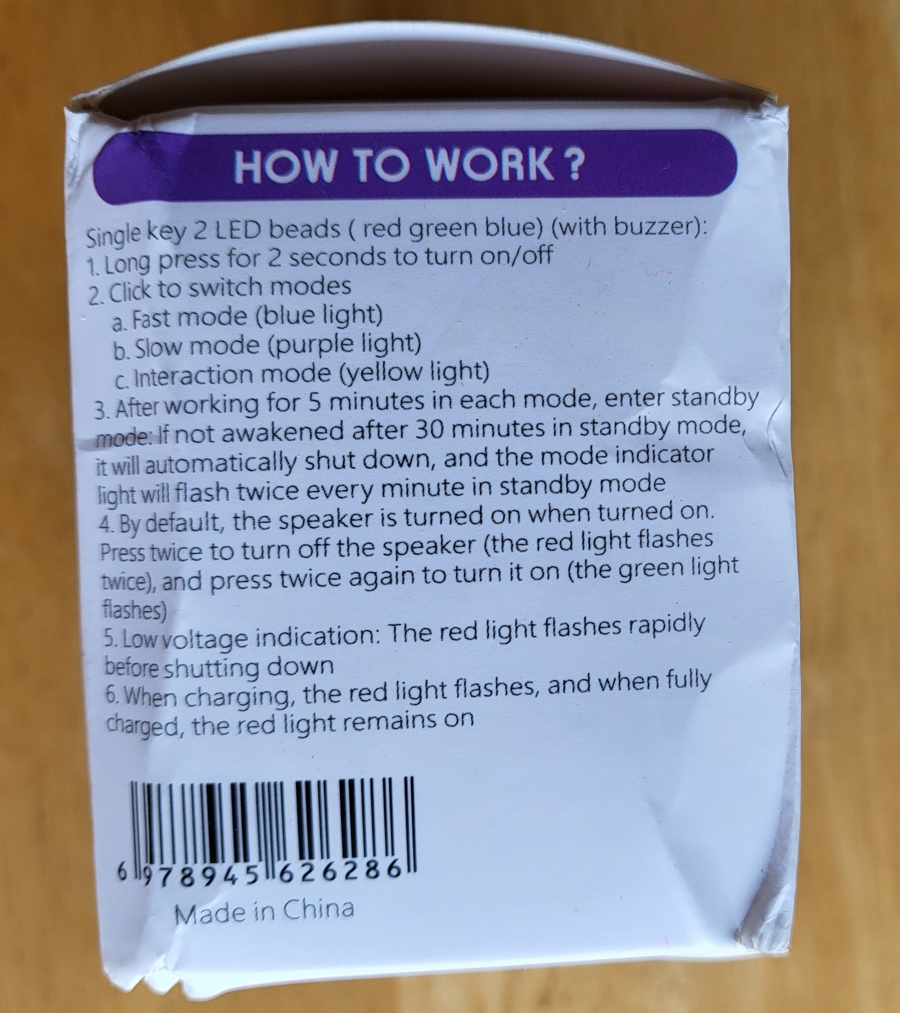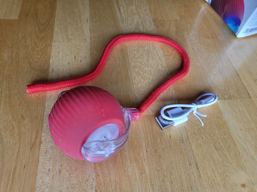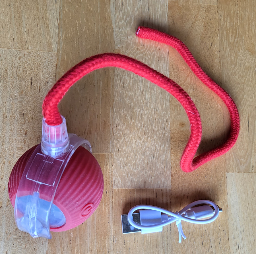 Interactive Rechargeable Cat Toy made of soft-touch silicone. Features 3 play modes and LED light colors, automatic obstacle avoidance, and long battery life. Suitable for cats and small dogs. Measures about 2.5" in diameter with 13" tail. In original packaging, box has some damage but toy is in PURRfect condition!