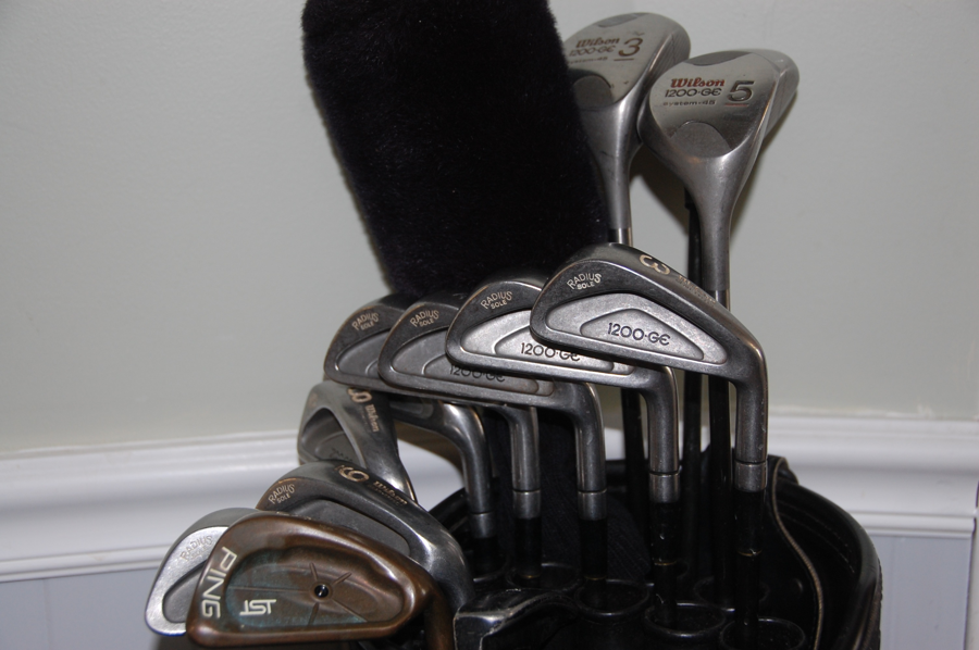 Set of used Wilson 1200 GE (Gear Effect) irons 3-PW, Ping SW and 12 degree Driver, 3 & 5 Wilson wood, plus Callaway 5 wood and putter. Good buy for beginning golfer.