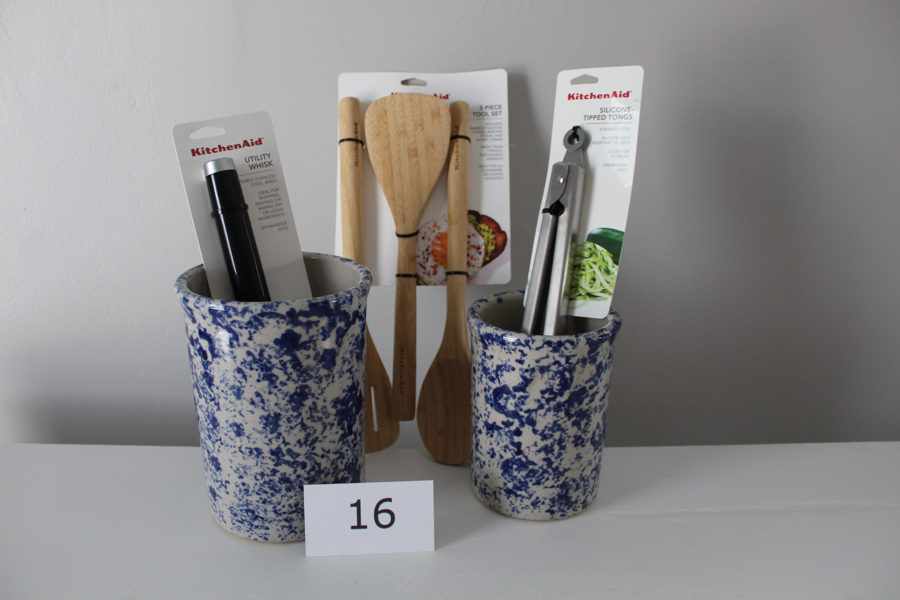 1 qt. & 2 qt. Utensil Pottery Crocks & (5) Kitchen Aid Utensils: Silicone Tipped Tongs, Utility Whisk, (3) Piece Bamboo Tool Set (Slotted Turner, Basting Spoon & Short Turner)