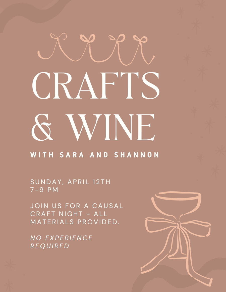 They’ll provide the materials for a craft, lots of wine, and snacks. No crafting experience required! (Also, drinking wine is not required!)