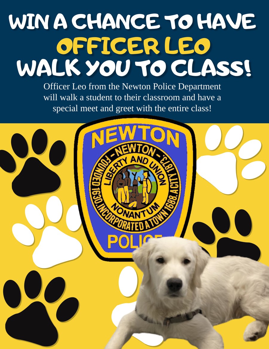 Newton Police Department's very own Community Resource Dog, Officer Leo, will meet our winning student at the start of the school day. The lucky student will then walk Leo to class for a special visit with their classmates!