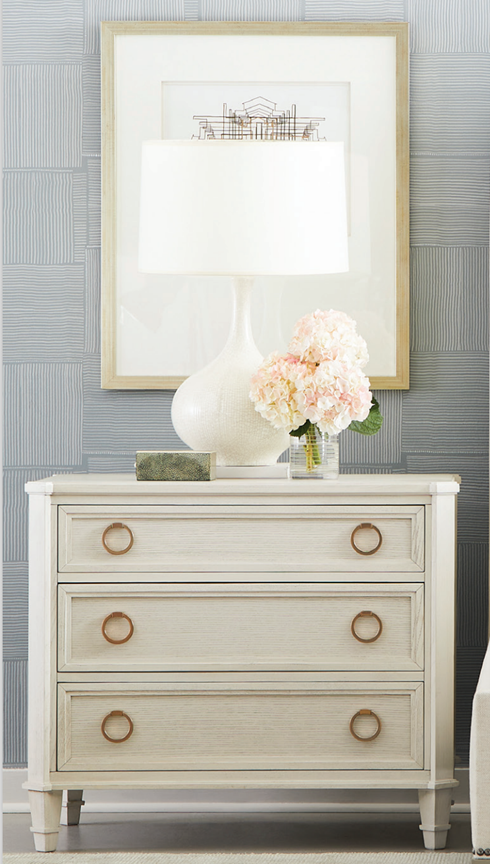 The Vanguard Furniture Michael Weiss Collection Sesta Table/Chest is a sophisticated piece of furniture that combines traditional American craftsmanship with modern simplicity. It features three drawers, and Sesta Bronze hardware. This lamp table/chest is designed to enhance the aesthetic of any living space, offering both style and functionality.