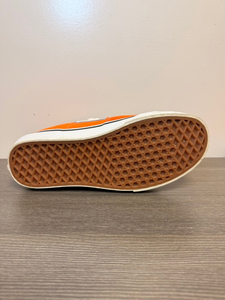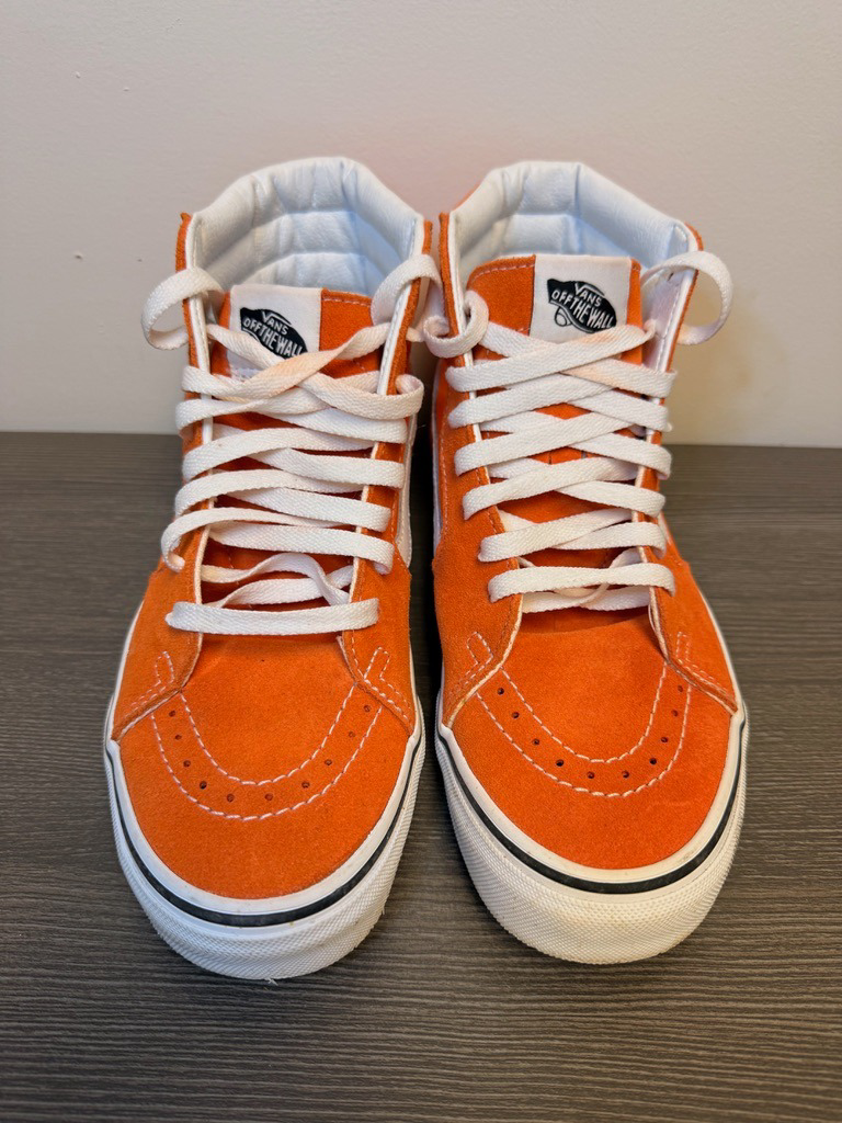 These hi-top sneakers are made from canvas uppers with the iconic white sidestripe of the Van brand. They are made from premium leather and canvas construction with a tapered fit and vulcanized construction for flexibility. There is a padded collar for enhanced comfort and support. The sole is the signature waffle design for superior grip. It is a versatile choice of shoe for any wardrobe. There is no wear evidence on the shoe.