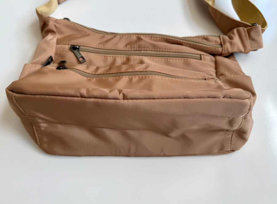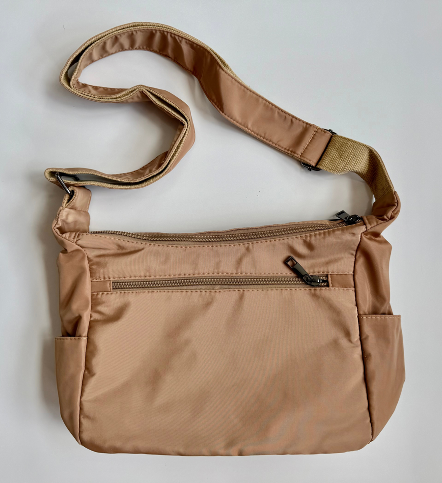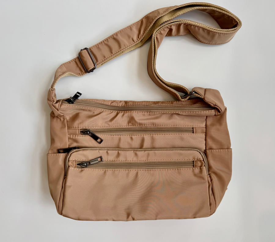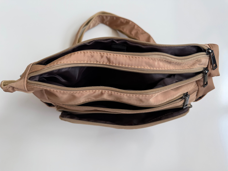 With an adjustable strap, this fashionable and practical multi-pocket bag converts from a handbag to a shoulder bag or a crossbody bag. Khaki color. 11.2 x 4 x 8 inches.