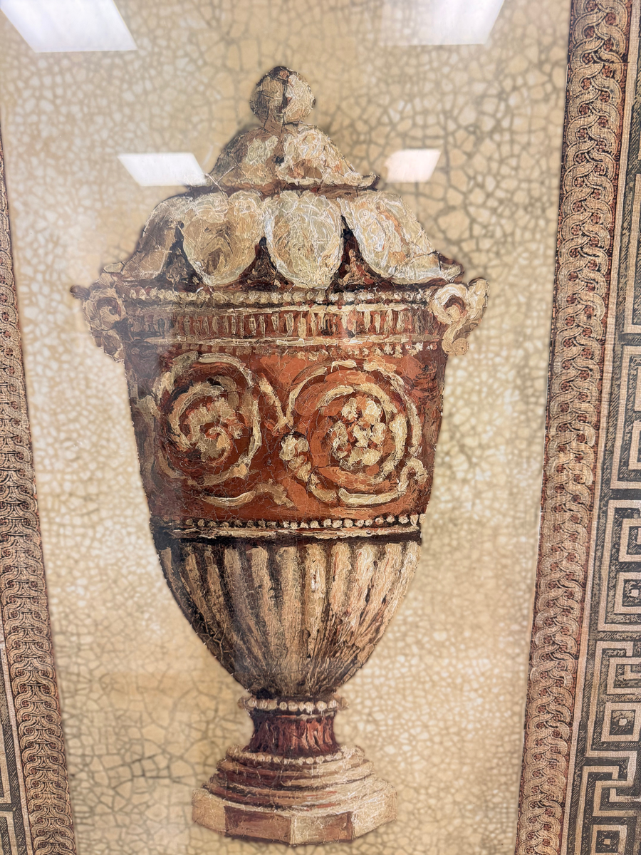 This well known artwork features a classical, ornamental urn or vase with ornate handles, set against a textured, crackle-patterned background, and bordered by a traditional Greek key design. The matting is brown. The entire piece is in great condition . If the art piece doesn’t suit your taste or décor, the solid wooden frame is ready to be repurposed and hung on a wall. Come to visit Restart to see the piece in person while it is on auction.