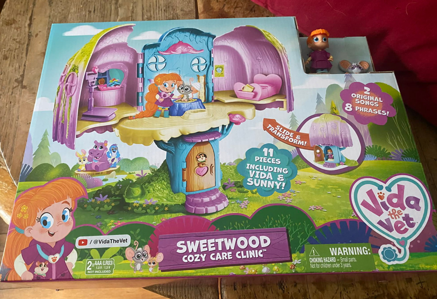 Vet clinic/treehouse playset with action figures, dollhouse furniture & accessories, suitable for ages 3 and up / Clinique vétérinaire/maison dans les arbres avec figurines, meubles et accessoires pour maison de poupées, convient aux enfants de 3 ans et plus.