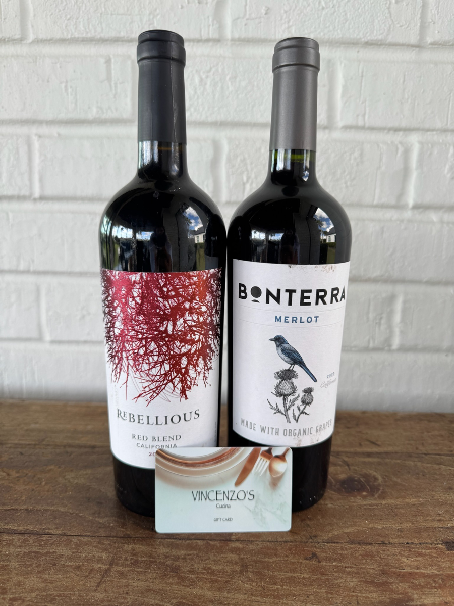 Enjoy a $100 gift card along with two quality bottles of wine: the elegant Bonterra Merlot 2022 known for its rich, smooth character, and the bold, flavorful Rebellious Red Blend 2020. Must be 21+