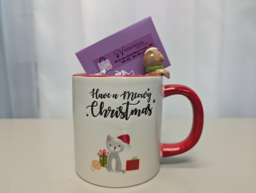 $60.00 Vivacious Clothing and Day Spa gift card wrapped inside a Christmas mug that reads 'Have a Meowy Christmas'.