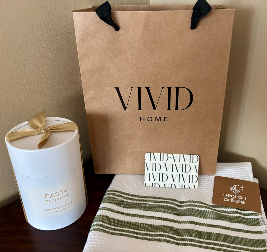 VIVID HOME ITEMS: $150 Gift card to use on home decor in the Vivid Home store in the North Loop. Plus, an East Division scented candle by Lux Parada and an Aegean Breeze oversized kitchen towel. Donated by Vivid Home-Danielle Loven