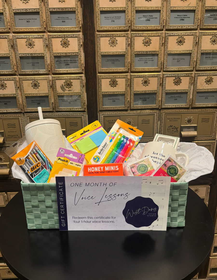 This basket includes a gift certificate for four one-hour voice lessons with Dr. Ashley West-Davis, everything you need to make the perfect cup of pre-lesson tea, supplies for organizing and marking sheet music, and a water tumbler to stay hydrated during lessons.