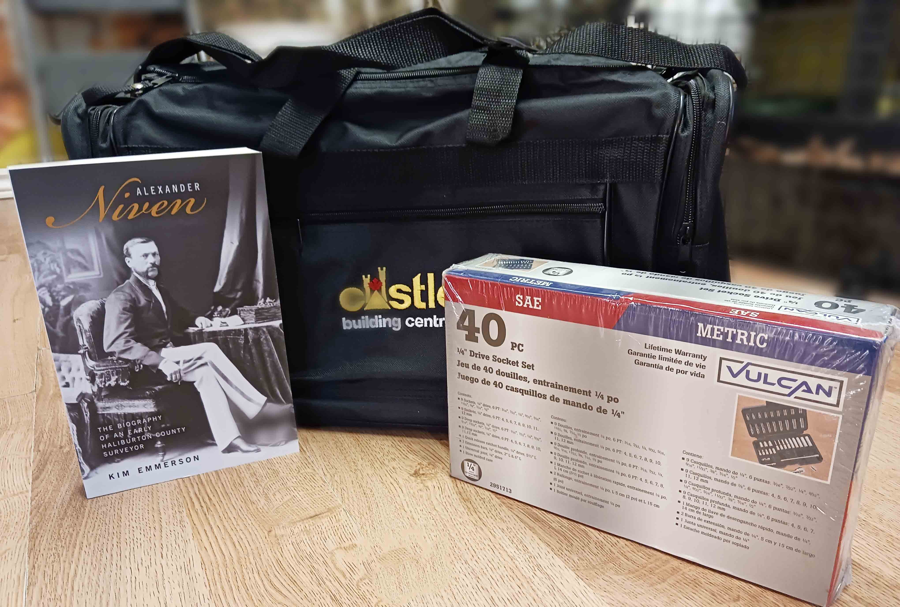 40 pc. Vulcan Chrome 1/4" socket set Castle Building Centre duffle bag BONUS! Alexander Niven biography book - early Haliburton County surveyor - written by Kim Emmerson.