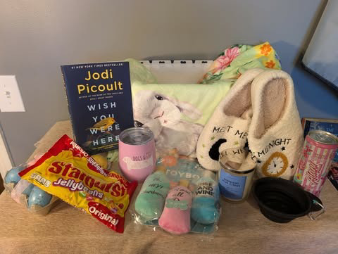 For a relaxing night in, slip into the cozy “Meet Me at Midnight” slippers, light the Midnight Blue Citrus candle, curl up under the soft 50x60 plush Easter throw, and dive into Jodi Picoult’s Wish You Were Here. Decorative eggs add a festive Easter touch to this charming basket.