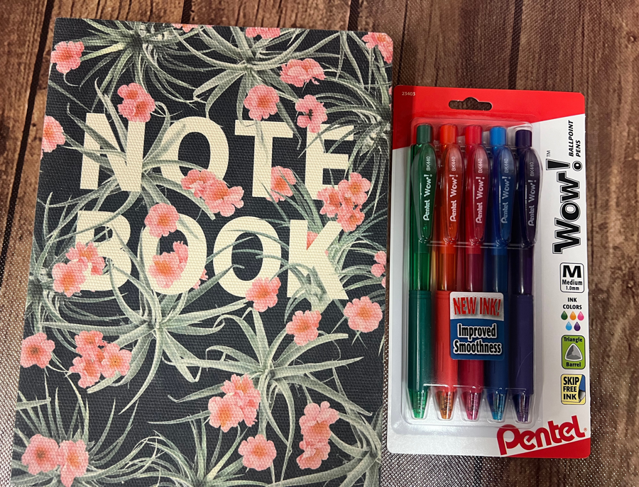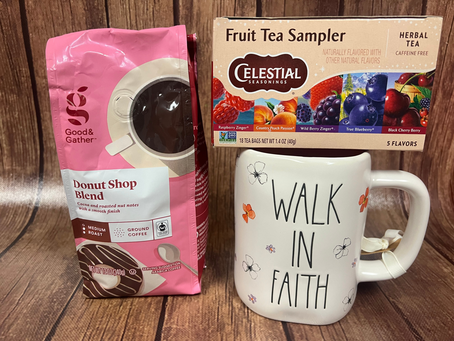 Notebook and pens Coffee mug, box of tea and coffee (donut shop blend)